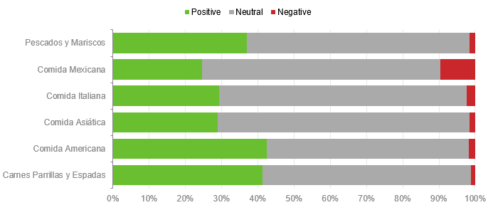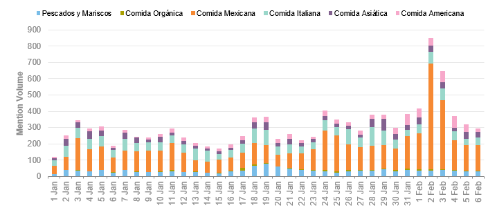 Podemos ir más a fondo con este análisis de sentimiento, para lo cual, primero definiremos las categorías con un mayor índice de conversación que, en este caso, son más altas para la “Comida Mexicana” que ocupa el 48% del total del volumen de menciones. Como antes mencionamos, esto se debe en buena medida al Día de la Candelaria.