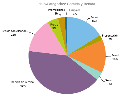 La gente no sólo conversa sobre “Comida Mexicana” o “Comida Italiana” en las redes. La gente busca los complementos como las “Bebidas sin Alcohol” o las que lo contienen, pero también enfoca las búsquedas y la conversación en temas como el “Precio” (1,167 menciones), el “Servicio” (857 menciones) o las “Promociones” (695 menciones).