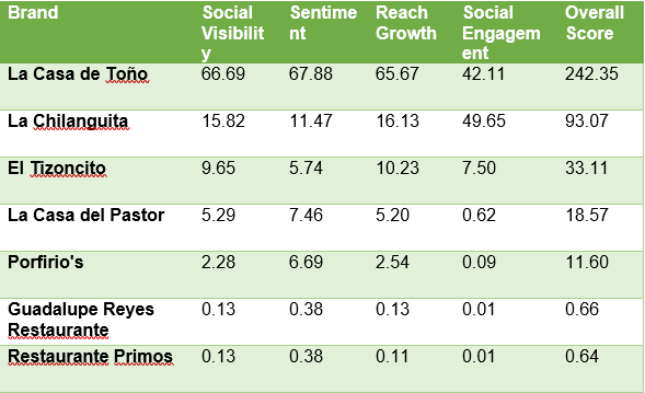 Al realizar el Benchmarking, podemos darnos cuenta que “La Casa de Toño”, obtuvo un buen rendimiento general, en parte debido a su alta Visibilidad Social. Sin embargo, también se puede detectar un área de oportunidad para ellos en el rubro de Social Engagement.